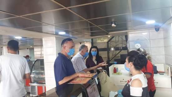 بجولة على بعض القطاعات الخدمية (سياحية وتجارية ) والإنتاجية في محافظة طرطوس بتاريخ يوم الثلاثاء في ٢٠٢٠/٨/٤ حيث تم التأكيد على ضرورة الإلتزام بإجراءات وضوابط ومعايير السلوك الصحي السليم والسلامة المهنية الواجب تطبيقها وخاصة التباعد المكاني وتخفيف الإزدحام _ إرتداء الكمامة _ التأكد من وجود شروط الصحة والسلامة المهنية والتهوية المناسبة _ التنظيف الدوري للأرضيات وللأسطح وقبضات الأبواب والحمامات بالكلور _ ونشر ملصقات عن المرض وطرق إنتقاله وأساليب الوقاية منه .