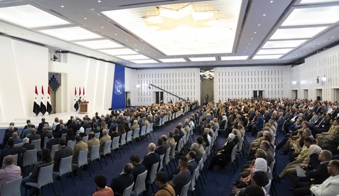 وتابع الرئيس الأسد: السيدات والسادة، نحن اليوم جزء من عالم هائج تتصارع أقطابه، والصراع لن يهدأ حتى يحسم أحد الأطراف النتائج لصالحه أو يحصل توازن قوى، حتى ذلك الوقت عالمنا هو غابة لا مكان فيه للإنسانية والأخلاق، حرب مباشرة أو عبر وكلاء، دعم إرهاب، إسقاط دول، تجويع شعوب، ساحة بلا حدود وبلا قواعد ونحن في وسطها، لا مكان للهروب منها أو للحياد فيها وأخطر ما فيها هو الحرب النفسية التي تهدف لترويض الشعوب بعد نسف ثقافاتها وإعادة تشكيل مفاهيمها وقد أثبتنا في هذه الحرب أننا شعب لا يدجن وعيه ولا تنسخ هويته ولا ينسف انتماؤه، وأن الشعوب العريقة تحيا في الواقع الحي لا في الواقع الافتراضي، فلا تبرمجها حواسيب الدجل ولا تمحي ذاكرتها فيروسات الخداع ولا تسقط في فخ الاستسلام المجاني على المنصات الافتراضية.