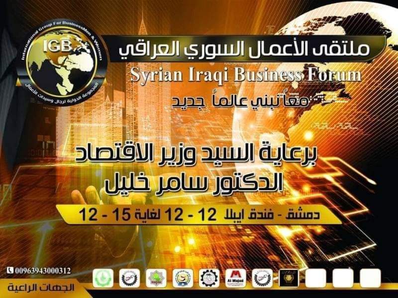 عقدت المجموعة الدولية لرجال وسيدات الاعمال مؤتمرا صحفيا مساء اليوم في مكتبة الاسد تم الاعلان فيه عن اقامة ملتقى الاعمال السوري العراقي ومعرض تصدير المنتحات تخت رعاية وزارة الاقتصاد السورية يوم الاحد القادم في قصر المؤتمرات بحضور كل من الامين العام للمجموعة ومديرها العام وممثلين عن غرفة الصناعة ومكتب محمد العساف للخدمات الهندسية وعن اتحاد المقاولين وممثلين من السفارة العراقية بدمشق