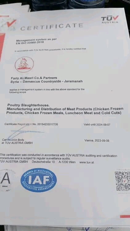 حاصلة على شهادة الأيزو 22000 و9001٠ لجودة وسلامة الغذاء