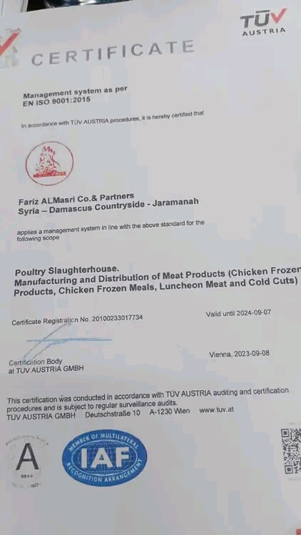 حاصلة على شهادة الأيزو 22000 و9001٠ لجودة وسلامة الغذاء