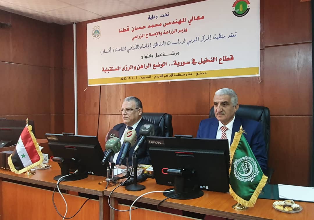 تحت رعاية معالي وزير الزراعة والإصلاح الزراعي المهندس محمد حسان قطنا افتتحت في مقر منظمة المركز العربي لدراسات المناطق الجافة والأراضي القاحلة “أكساد” اليوم، أعمال ورشة العمل تحت عنوان ” قطاع النخيل في سورية الواقع الراهن والرؤى المستقبلية ” حضورياً بمشاركة عدد من المدراء المركزيين في وزارة الزراعة والإصلاح الزراعي، والهيئة العامة للبحوث العلمية الزراعية، والهيئة العامة لتنمية وتطوير البادية، وعمداء كليات الزراعة ومدراء الزراعة في المحافظات، وعبر تقنية الفيديو كونفيرانس بمشاركة المجلس الدولي للتمور في المملكة العربية السعودية، وخبراء كبار من مصر وتونس والأردن وسلطنة عمان والعراق ولبنان وعدد من المؤسسات التعليمية والبحثية والمنظمات الدولية.