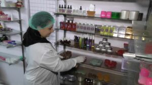 بمواد طبيعية تنتج المهندسة راميا بشير (إحدى المستفيدات من هيئة تنمية المشاريع الصغيرة) مستحضراتها التجميلية، وذلك في محلها الصغير بحي الزقزقانية باللاذقية.