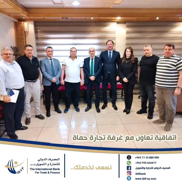 تم توقيع اتفاقية تعاون بين المصرف الدولي للتجارة والتمويل ممثلا بالرئيس التنفيذي السيد فادي الجليلاتي وغرفة تجارة حماة ممثلة برئيس الغرفة السيد يوسف الاصفر ، وتقدم الاتفاقية باقة من الخدمات والتسهيلات المصرفية تضم قروض وتسهيلات مصرفية غير مباشرة ومنح أسعار تفضيلية للودائع وغيرها من الخدمات التي تلبي كافة الاحتياجات التمويلية والمصرفية للسادة اصحاب الفعاليات التجارية في محافظة حماة.