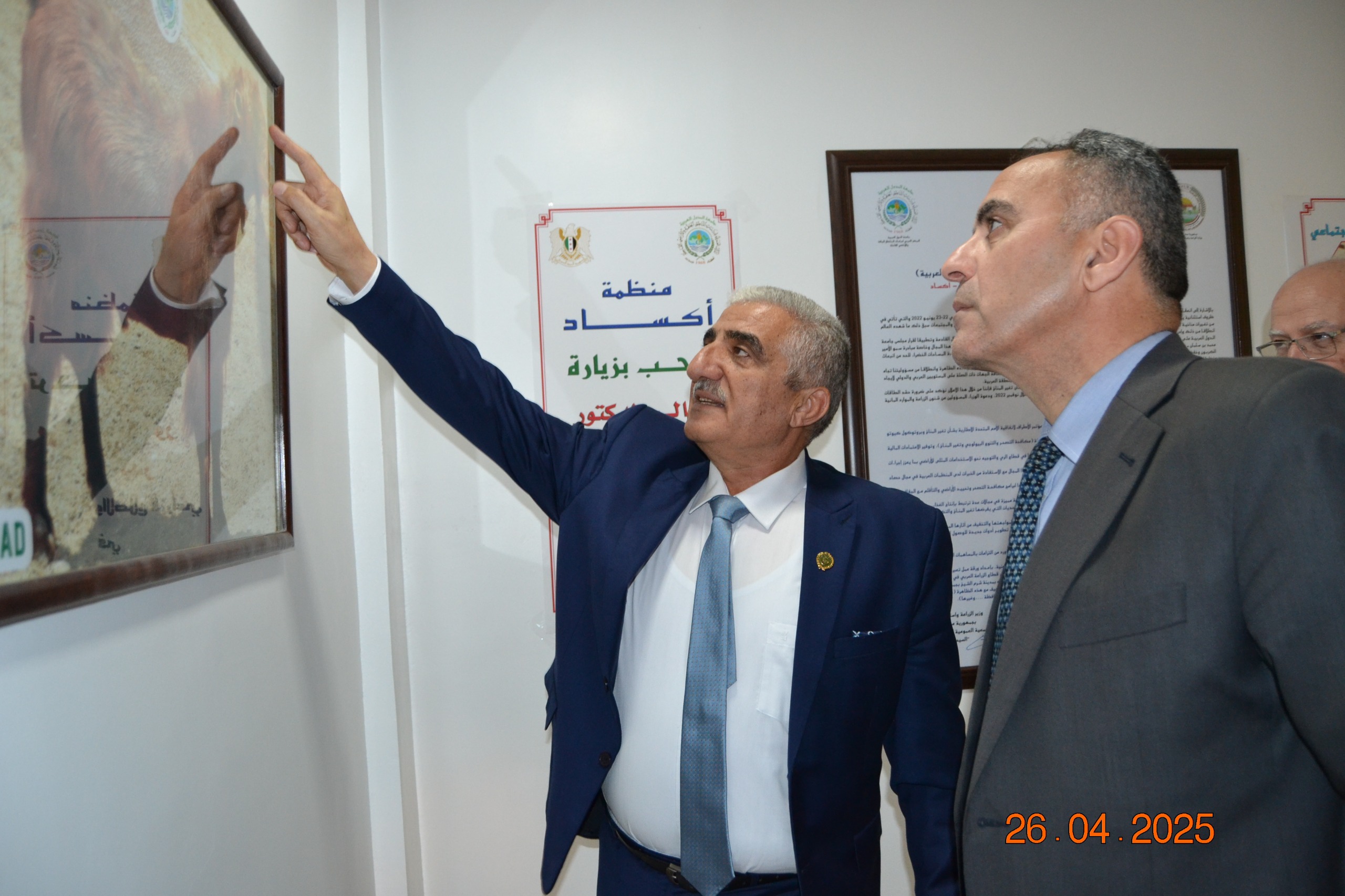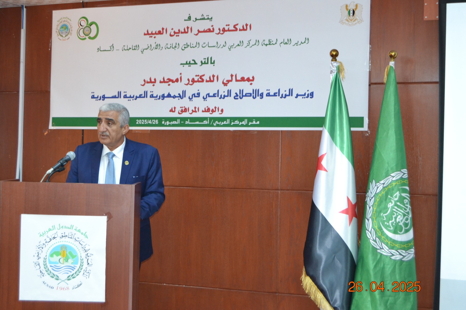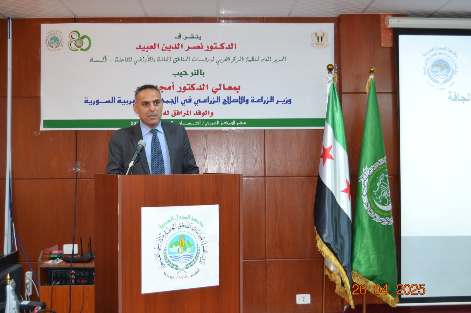 استقبل سعادة الدكتور نصر الدين العبيد المدير العام لمنظمة المركز العربي لدراسات المناطق الجافة والأراضي القاحلة “أكساد” معالي الدكتور أمجد بدر وزير الزراعة والإصلاح الزراعي في الجمهورية العربية السورية، في مقر المنظمة بدمشق اليوم 26 نسيان/ أبريل 2025، برفقة عدد من المدراء والمسؤولين في الوزارة، بحث الجانبان سُبل تعزيز وتنسيق التعاون المشترك لمواجهة التحديات الزراعية والآثار السلبية للتغيرات المناخية، وإيجاد الحلول المناسبة لتحقيق التنمية المستدامة في سورية والدول العربية.
