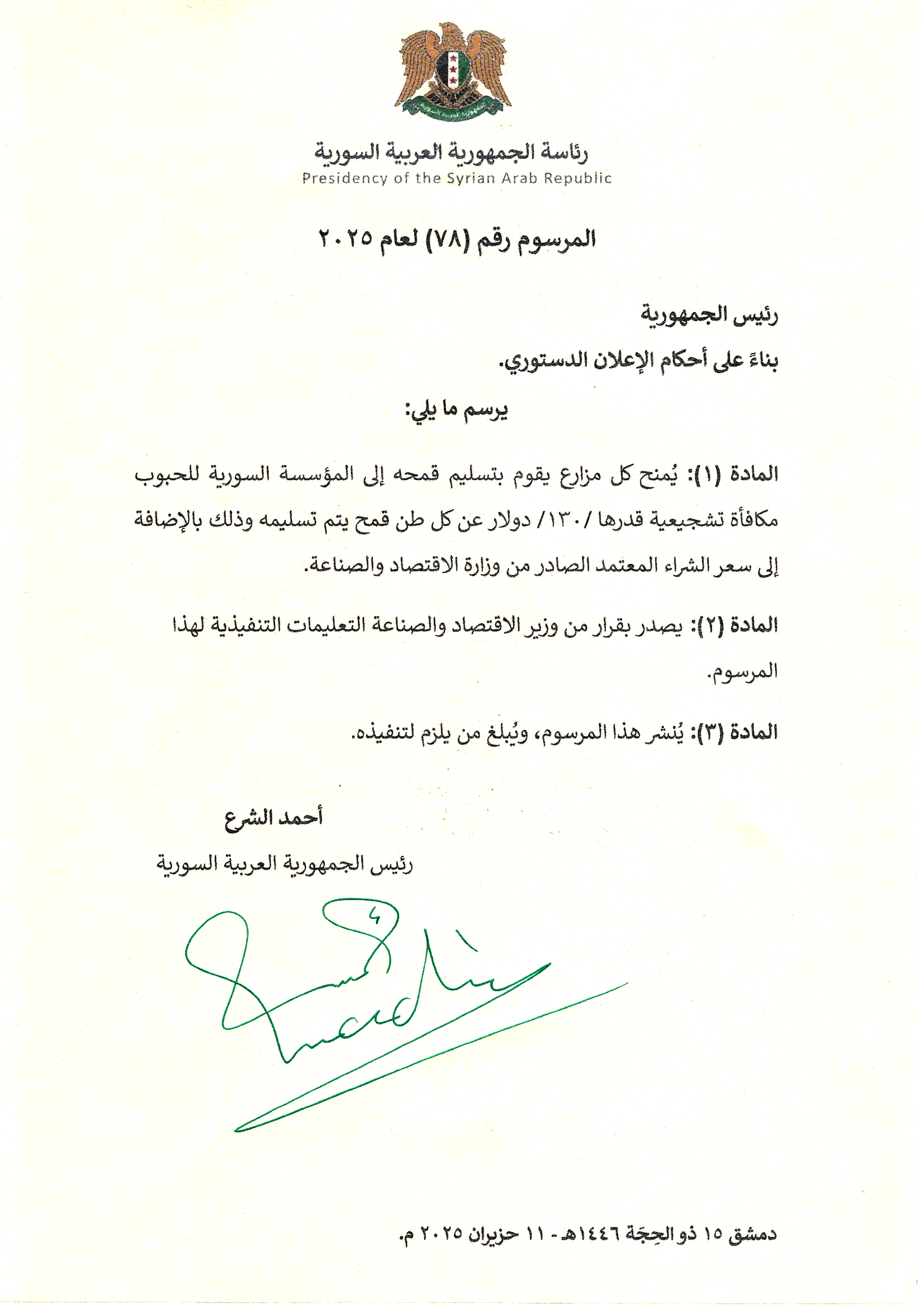 أصدر السيد الرئيس أحمد الشرع اليوم المرسوم رقم 78 لعام 2025 القاضي بمنح كل مزارع يقوم بتسليم قمحه إلى المؤسسة السورية للحبوب مكافأة تشجيعية قدرها 130 دولاراً عن كل طن قمح يتم تسليمه، وذلك بالإضافة إلى سعر الشراء المعتمد الصادر من وزارة الاقتصاد والصناعة.