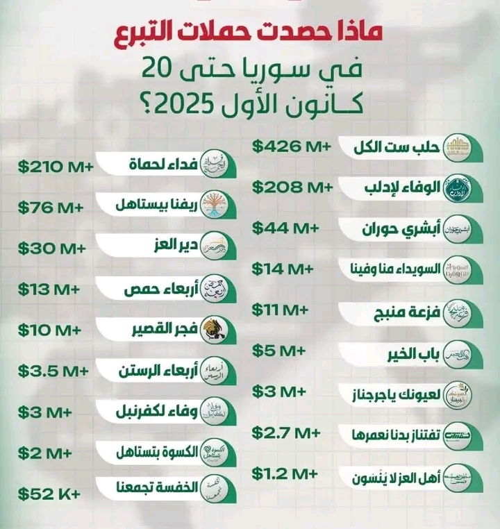 وتصدرت محافظة حلب قائمة المحافظات من حيث حجم التبرعات، بعدما جمعت أكثر من 426 مليون دولار عبر حملة «حلب ست الكل»، تلتها حملة «فداء لحماة» بأكثر من 210 ملايين دولار، ثم حملة «الوفاء لإدلب» التي تجاوزت 208 ملايين دولار. وريف دمشق 76 مليون دولار ودرعا 44 مليون دولار…