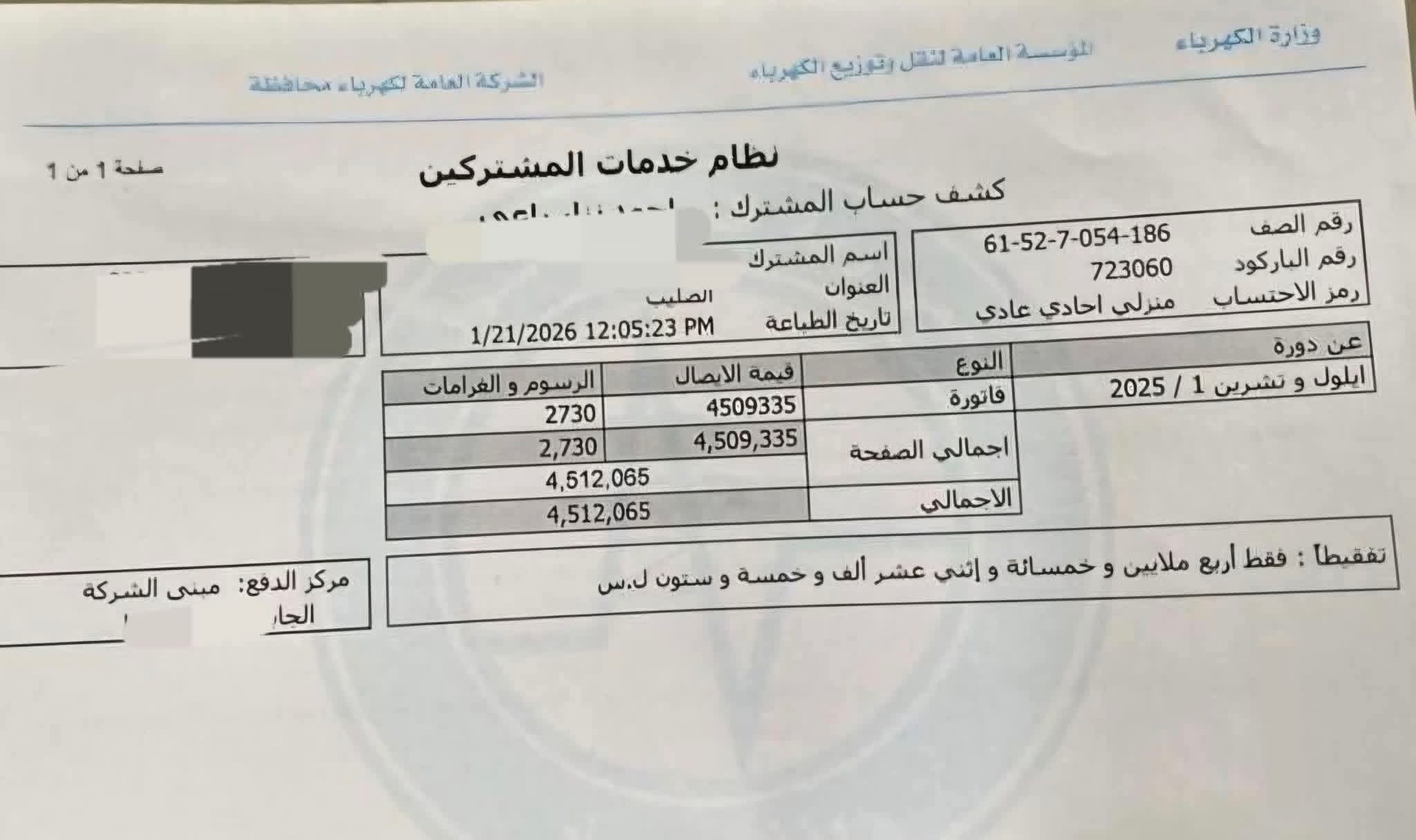 ويضيف: هناك من يقول إن المبالغ الكبيرة في فواتير الكهرباء ناتجة عن تطبيق التسعيرة الجديدة، إلا أن هذا الكلام غير دقيق. فالتسعيرة الجديدة تبدأ اعتباراً من الدورة السادسة لعام 2025، وهذه الدورة لم تصدر حتى الآن، ومن المفترض أن تصدر في بداية شهر آذار.. وحتى تاريخه، مرّ حوالي 25 يوماً على بداية الدورة الأولى لعام 2026، ولم يتم تسجيل تأشيرة الدورة السادسة لعام 2025 بعد، علماً أنه كان من المفترض تسجيلها مع نهاية السنة في 1/1/2026، أو على أبعد تقدير خلال الأيام الخمسة الأولى من الشهر.