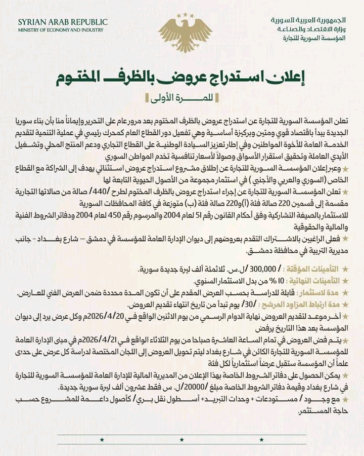 أعلنت المؤسسة السورية للتجارة عن إطلاق مشروع استدراج عروض استثنائي للمرة الأولى، يهدف إلى إقامة شراكات استثمارية مع القطاع الخاص السوري والعربي والأجنبي، وذلك لاستثمار مجموعة من الأصول الحيوية التابعة للمؤسسة بما يسهم في تطويرها وتعزيز كفاءتها الاقتصادية.