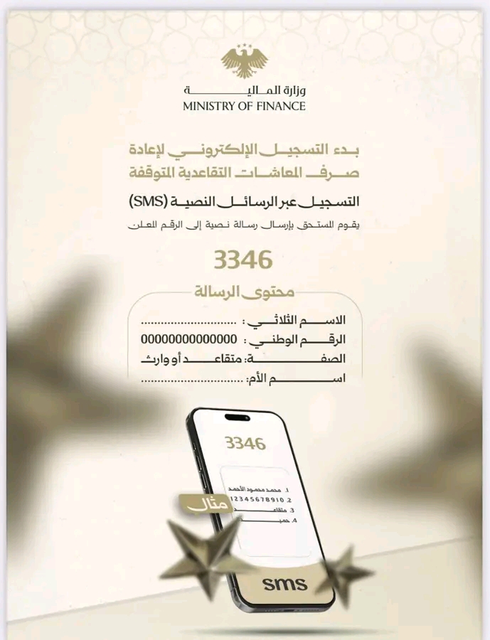 – يتعين أن تشمل الرسالة النصية أربع بيانات أو معلومات: الاسم الثلاثي، الرقم الوطني، الصفة: متقاعد او وراث لمتقاعد، اسم الأم.