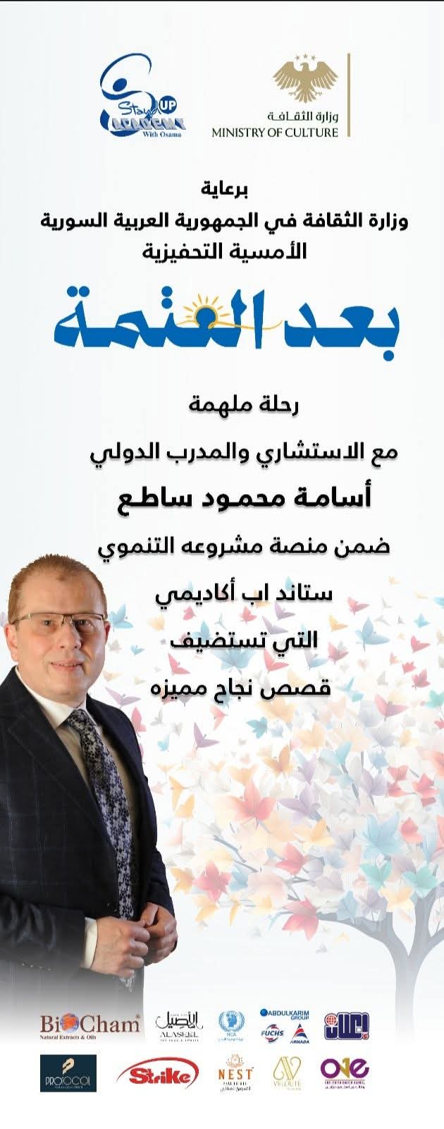 تواصل منصة مشروع “ستاند أب أكاديمي” التحفيزي التنموي الإبداعي، لمؤسسه المدرب الدولي أسامة محمود ساطع، نشاطاتها بإنطلاق فعاليتها ا لتاسعة في سوريا تحت عنوان ” بعد العتمة” ، وذلك على مسرح المكتبة الوطنية بدمشق، الساعة السادسة مساء يوم الاثنين 13 نيسان 2026.