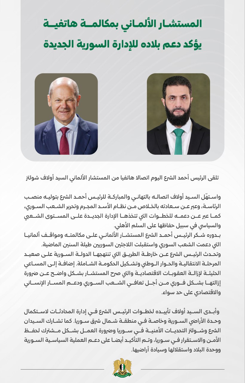 أخبار سورية عبر اتصال هاتفي الرئيس الفرنسي يهنئ الرئيس أحمد الشرع بتوليه منصب رئاسة الجمهورية 06/02/2025