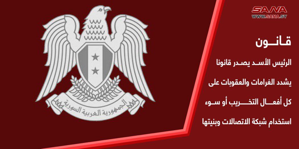 الرئيس الأسد يصدر قانوناً يشدد الغرامات والعقوبات على كل أفعال التخريب أو سوء استخدام شبكة الاتصالات وبنيتها 25/11/2024