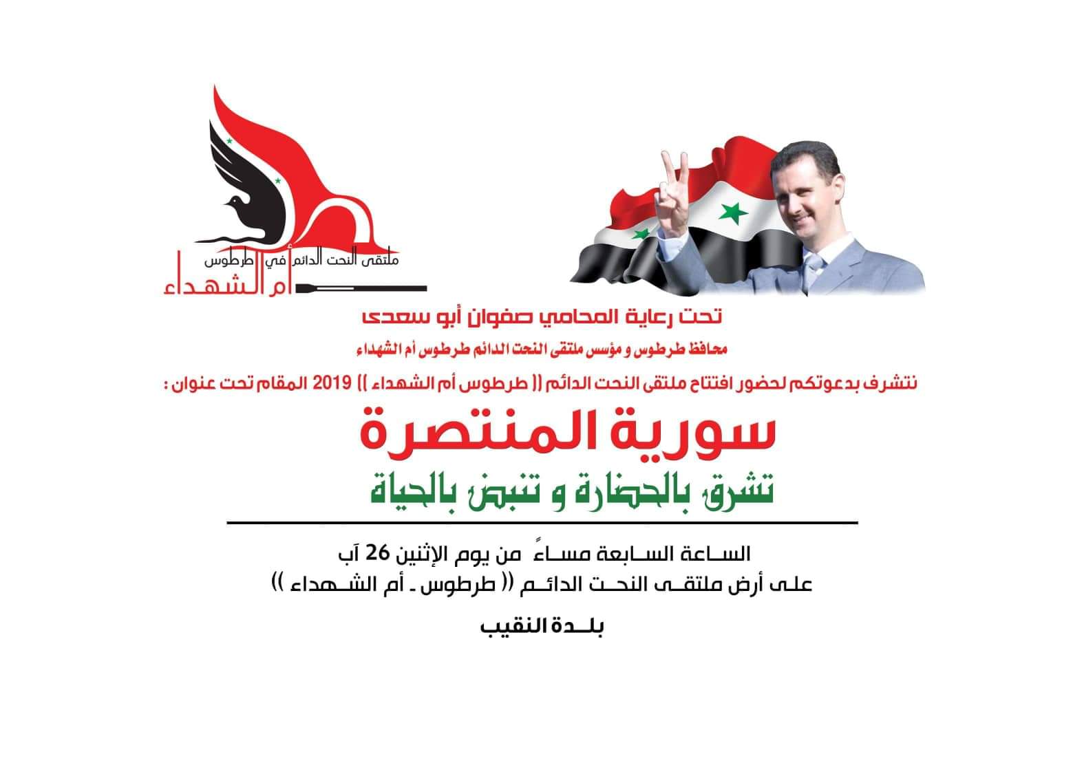 الاثنين القادم انطلاق ملتقى النحت الدائم في بلدة النقيب تحت عنوان ( سورية المنتصرة تشرق بالحضارة وتنبض بالحياة).. 23/08/2019
