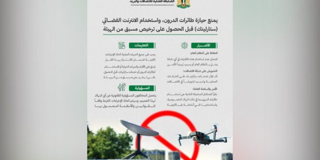 الهيئة الناظمة للاتصالات: منع حيازة طائرات الدرون والنت الفضائي قبل الحصول على إذن مسبق 10/03/2025